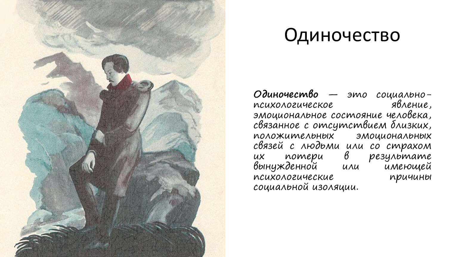 Одиночество — это социально-психологическое явление, эмоциональное состояние человека, связанное с отсутствием близких, положительных эмоциональных связей с людьми или со страхом их потери в результате вынужденной или имеющей психологические причины социальной изоляции.
