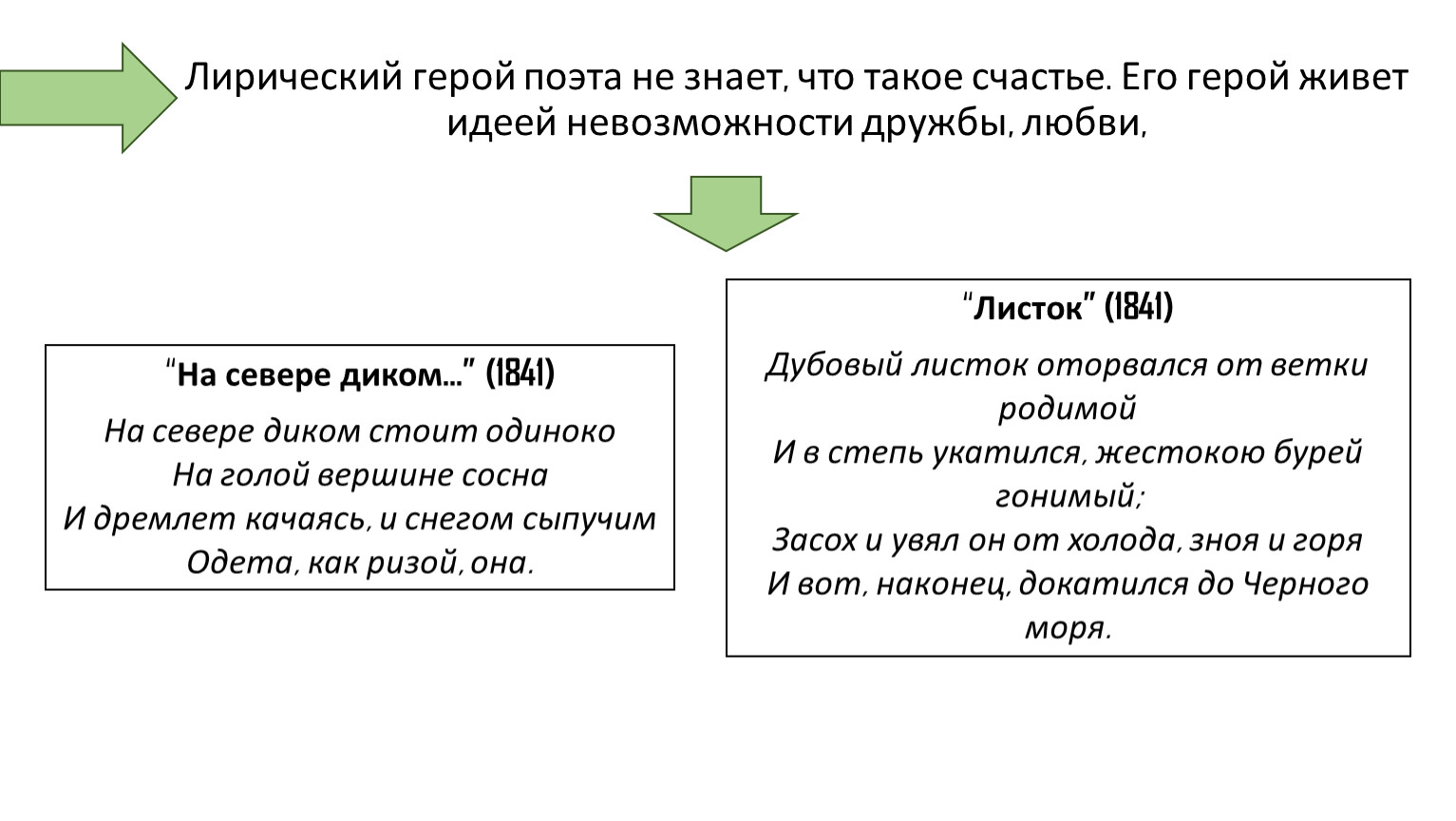 Дубовый листок оторвался от ветки родимойИ в степь укатился, жестокою бурей гонимый;Засох и увял он от холода, зноя и горяИ вот, наконец, докатился до Черного моря.