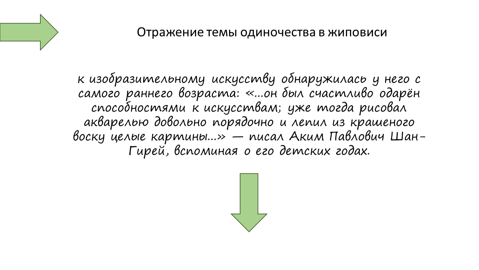 к изобразительному искусству обнаружилась у него с самого раннего возраста: «...он был счастливо одарён способностями к искусствам; уже тогда рисовал акварелью довольно порядочно и лепил из крашеного воску целые картины...» — писал Аким Павлович Шан-Гирей, вспоминая о его детских годах.