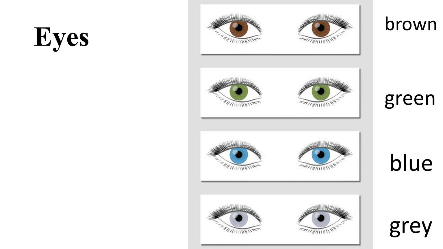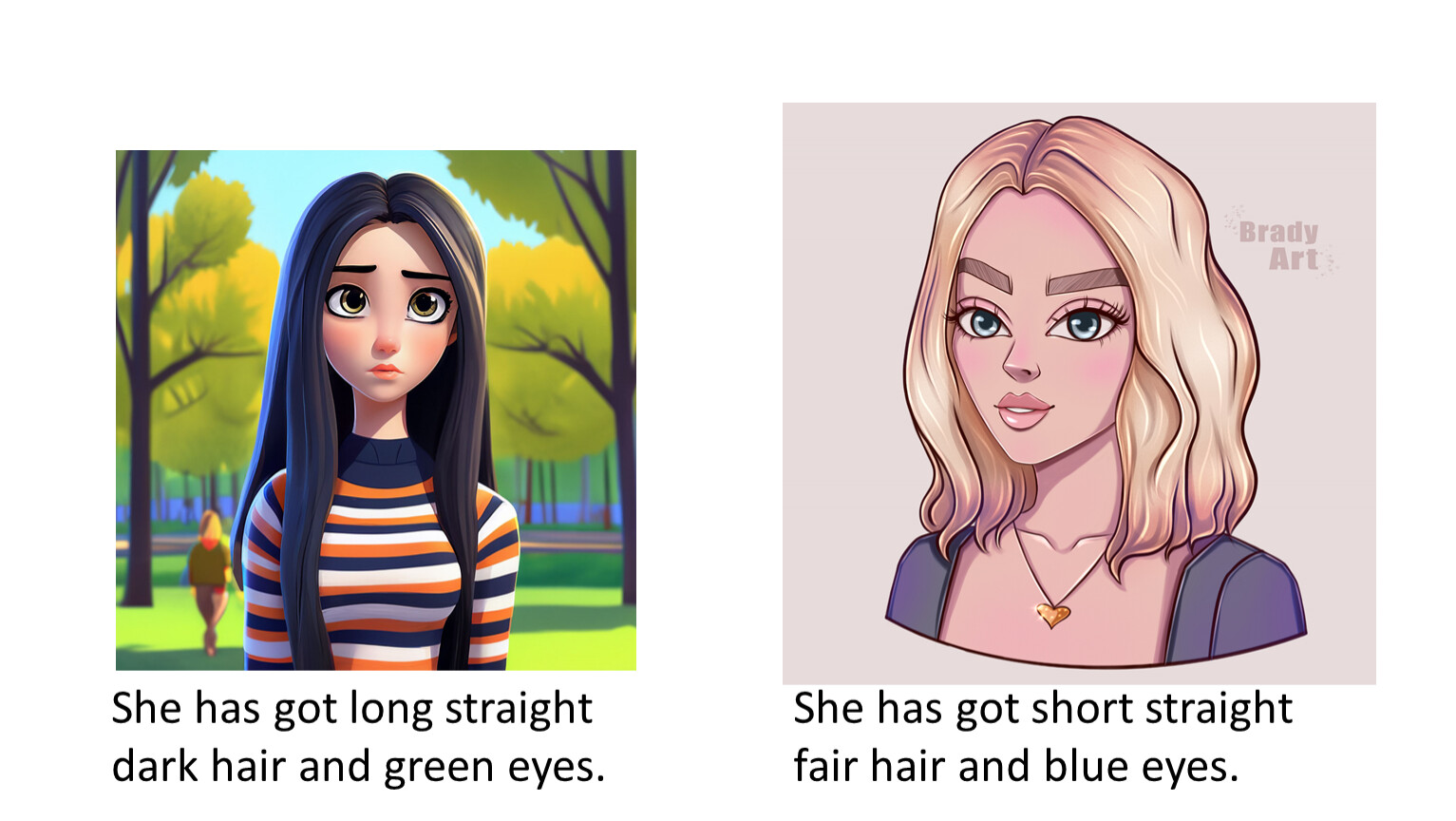She has got long straight dark hair and green eyes.
