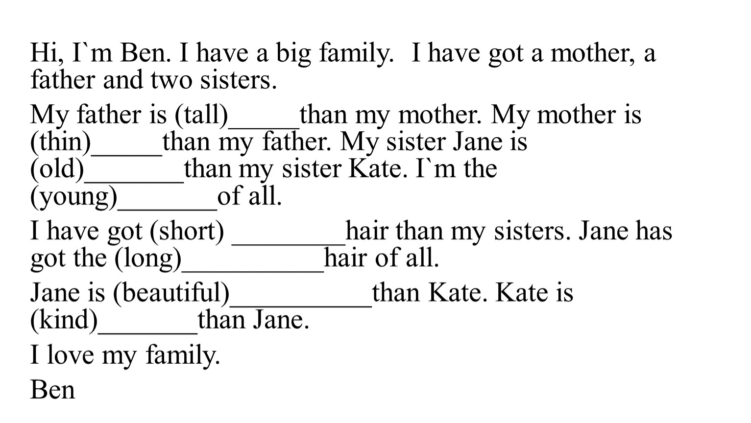 My father is (tall)_____than my mother. My mother is (thin)_____than my father. My sister Jane is (old)_______than my sister Kate. I`m the (young)_______of all.