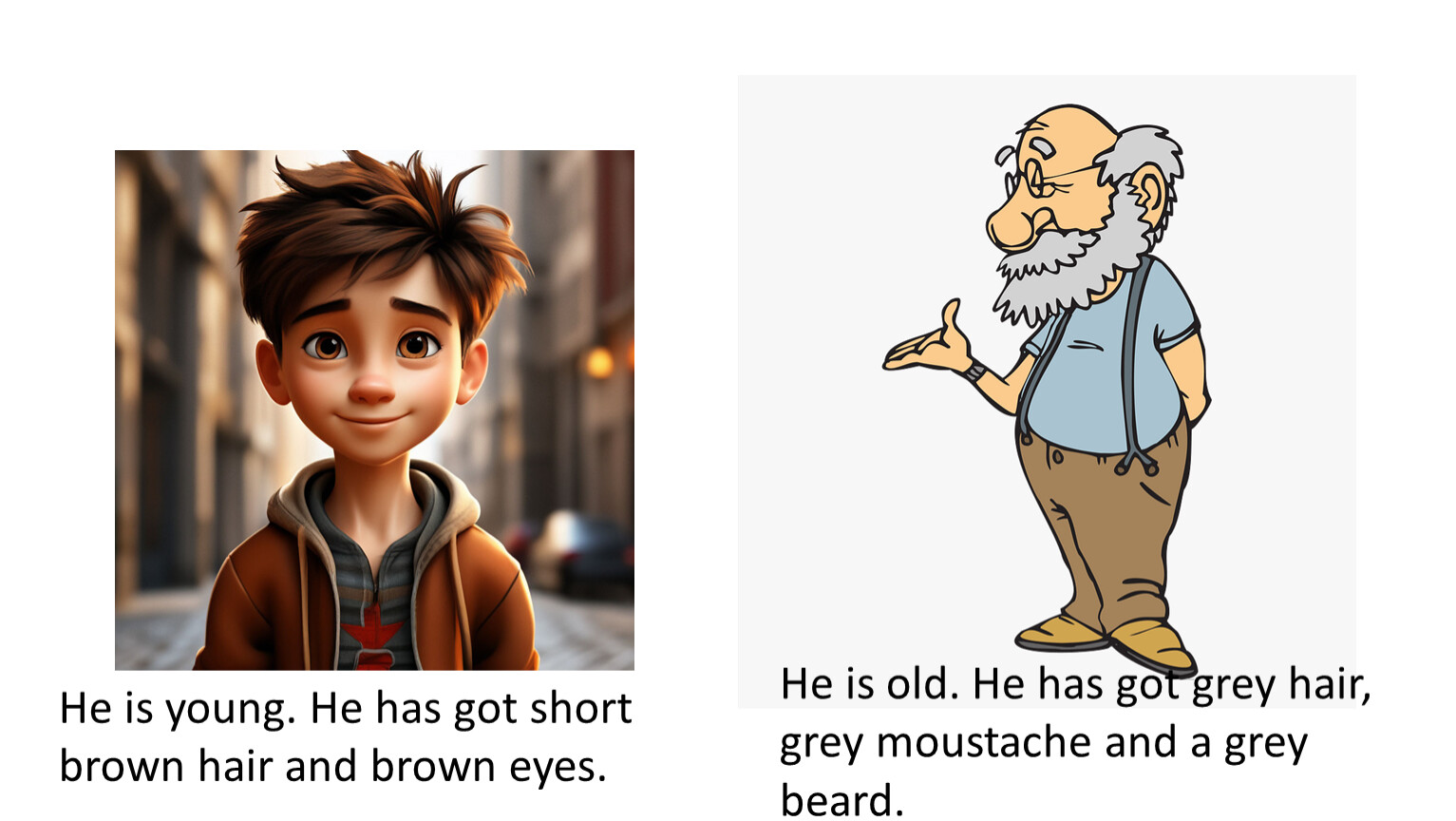 He is old. He has got grey hair, grey moustache and a grey beard.