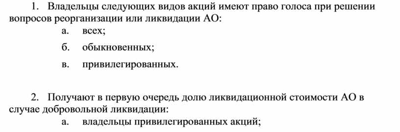 5. Владельцы следующих видов акций имеют право голоса при решении вопросов реорганизации или ликвидации АО: