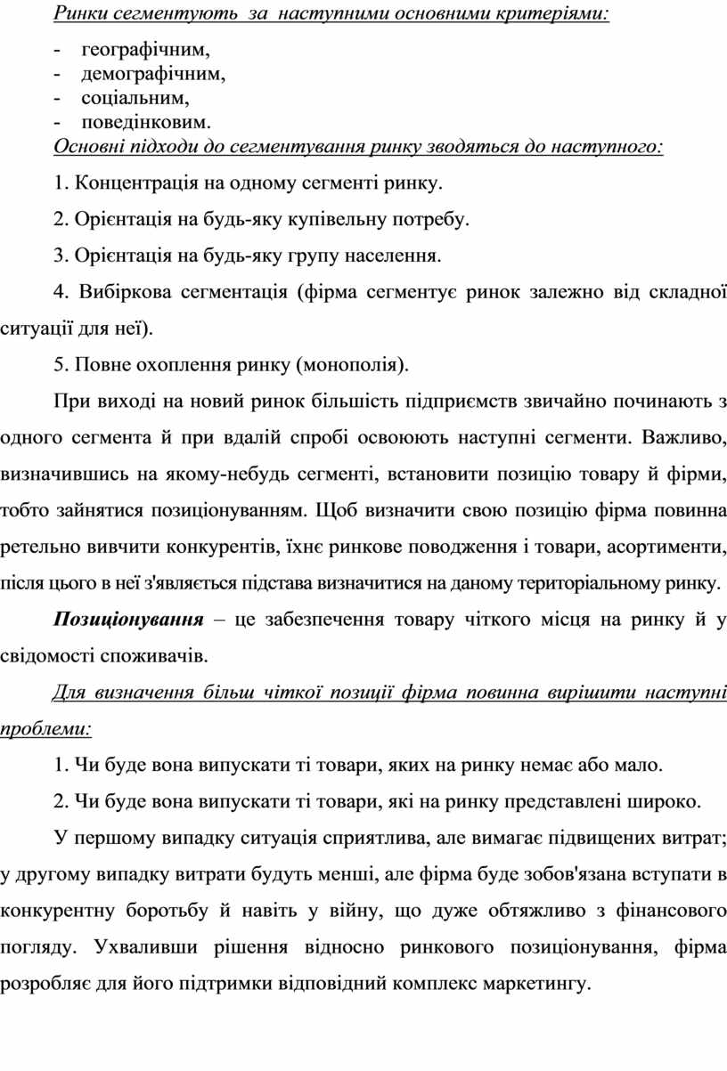 При виході на новий ринок більшість підприємств звичайно починають з одного сегмента й при вдалій спробі освоюють наступні сегменти. Важливо, визначившись на якому-небудь сегменті, встановити позицію товару й фірми, тобто зайнятися позиціонуванням. Щоб визначити свою позицію фірма повинна ретельно вивчити конкурентів, їхнє ринкове поводження і товари, асортименти, після цього в неї з'являється підстава визначитися на даному територіальному ринку.
