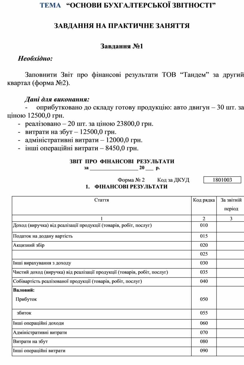 Заповнити Звіт про фінансові результати ТОВ “Тандем” за другий квартал (форма №2).