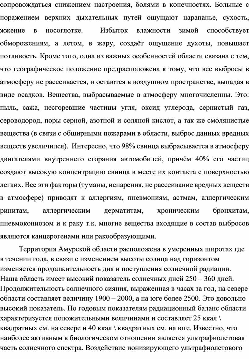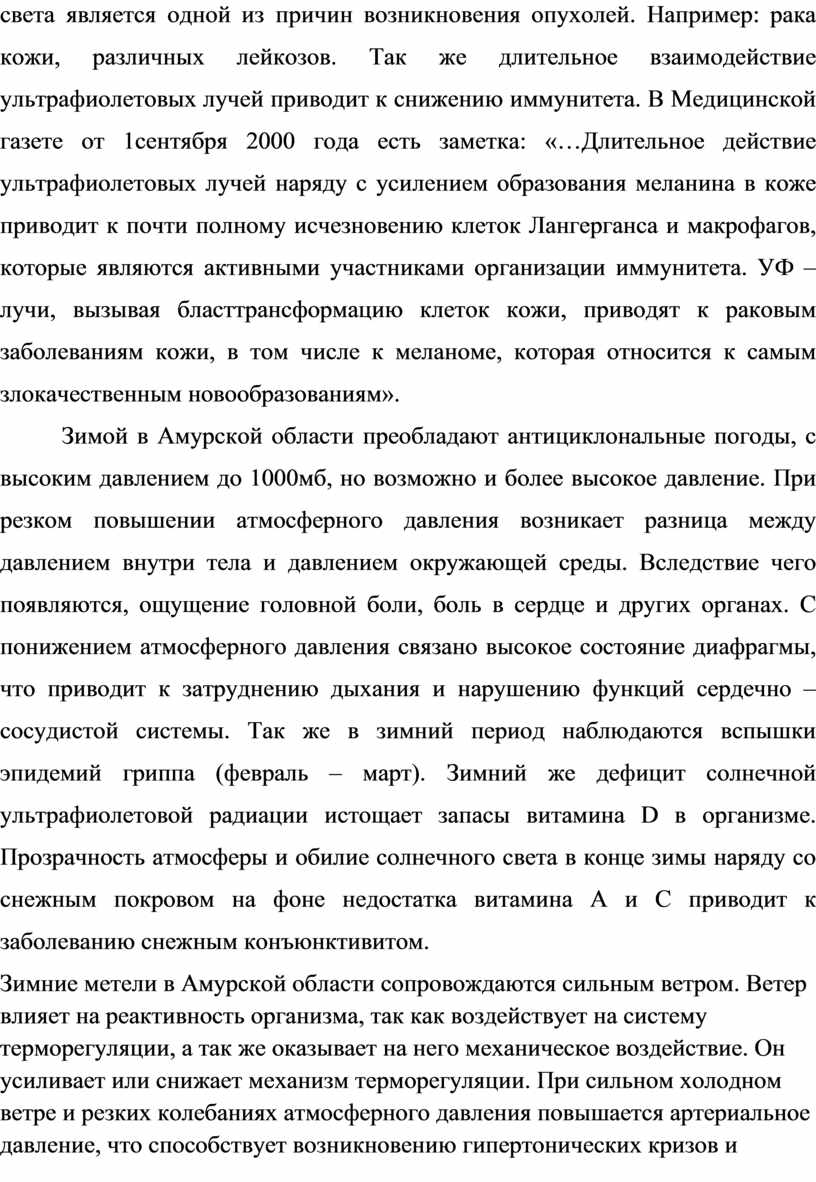 Территория Амурской области расположена в умеренных широтах где в течении года, в связи с изменением высоты солнца над горизонтом изменяется продолжительность дня и поступления солнечной радиации. Наша область имеет высокий показатель солнечных дней 250 – 360 дней. Продолжительность солнечного сияния, выраженная в часах за год, на севере области составляет величину 1900 – 2000, а на юге более 2500. Это довольно высокий показатель. По годовым показателям радиационный баланс области характеризуется положительными величинами и составляет 25 ккал \ квадратных см. на севере и 40 ккал \ квадратных см. на юге. Известно, что наиболее активным в биологическом отношении является ультрафиолетовая часть солнечного спектра. Воздействие ионизирующего ультрафиолетового света является одной из причин возникновения опухолей. Например: рака кожи, различных лейкозов. Так же длительное взаимодействие ультрафиолетовых лучей приводит к снижению иммунитета. В Медицинской газете от 1сентября 2000 года есть заметка: «…Длительное действие ультрафиолетовых лучей наряду с усилением образования меланина в коже приводит к почти полному исчезновению клеток Лангерганса и макрофагов, которые являются активными участниками организации иммунитета. УФ – лучи, вызывая бласттрансформацию клеток кожи, приводят к раковым заболеваниям кожи, в том числе к меланоме, которая относится к самым злокачественным новообразованиям».