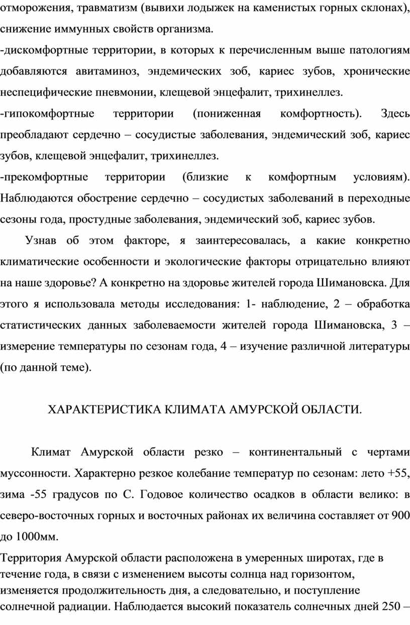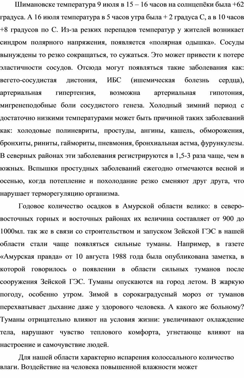 Для Амурской области характерен климат резко – континентальный с чертами муссонности. По сезонам наблюдается резкое колебание температур: максимальная летом + 55 градусов; зимой -55 градусов С. Так же наблюдается резкое колебании температур в течении суток: от 0 градусов до + 25 градусов С; и от 0 до -25градусов по С., например, в 2007 году в городе Шимановске температура 9 июля в 15 – 16 часов на солнцепёки была +62 градуса. А 16 июля температура в 5 часов утра была + 2 градуса С, а в 10 часов +8 градусов по С. Из-за резких перепадов температур у жителей возникает синдром полярного напряжения, появляется «полярная одышка». Сосуды вынуждены то резко сокращаться, то сужаться. Это может привести к потере эластичности сосудов. Отсюда могут появляться такие заболевания как: вегето-сосудистая дистония, ИБС (ишемическая болезнь сердца), артериальная гипертензия, возможна артериальная гипотония, мигренеподобные боли сосудистого генеза. Холодный зимний период с достаточно низкими температурами может быть причиной таких заболеваний как: холодовые полиневриты, простуды, ангины, кашель, обморожения, бронхиты, риниты, гаймориты, пневмония, бронхиальная астма, фурункулезы. В северных районах эти заболевания регистрируются в 1,5-3 раза чаще, чем в южных. Вспышки простудных заболеваний ежегодно отмечаются весной и осенью, когда потепление и похолодание резко сменяют друг друга, что нарушает терморегуляцию организма.