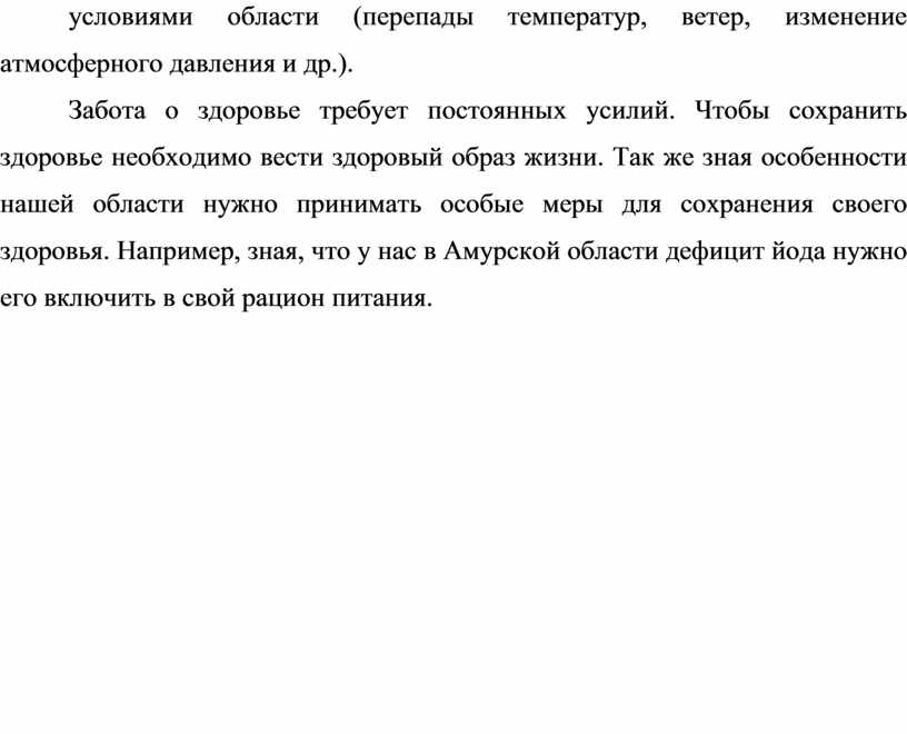Забота о здоровье требует постоянных усилий. Чтобы сохранить здоровье необходимо вести здоровый образ жизни. Так же зная особенности нашей области нужно принимать особые меры для сохранения своего здоровья. Например, зная, что у нас в Амурской области дефицит йода нужно его включить в свой рацион питания.