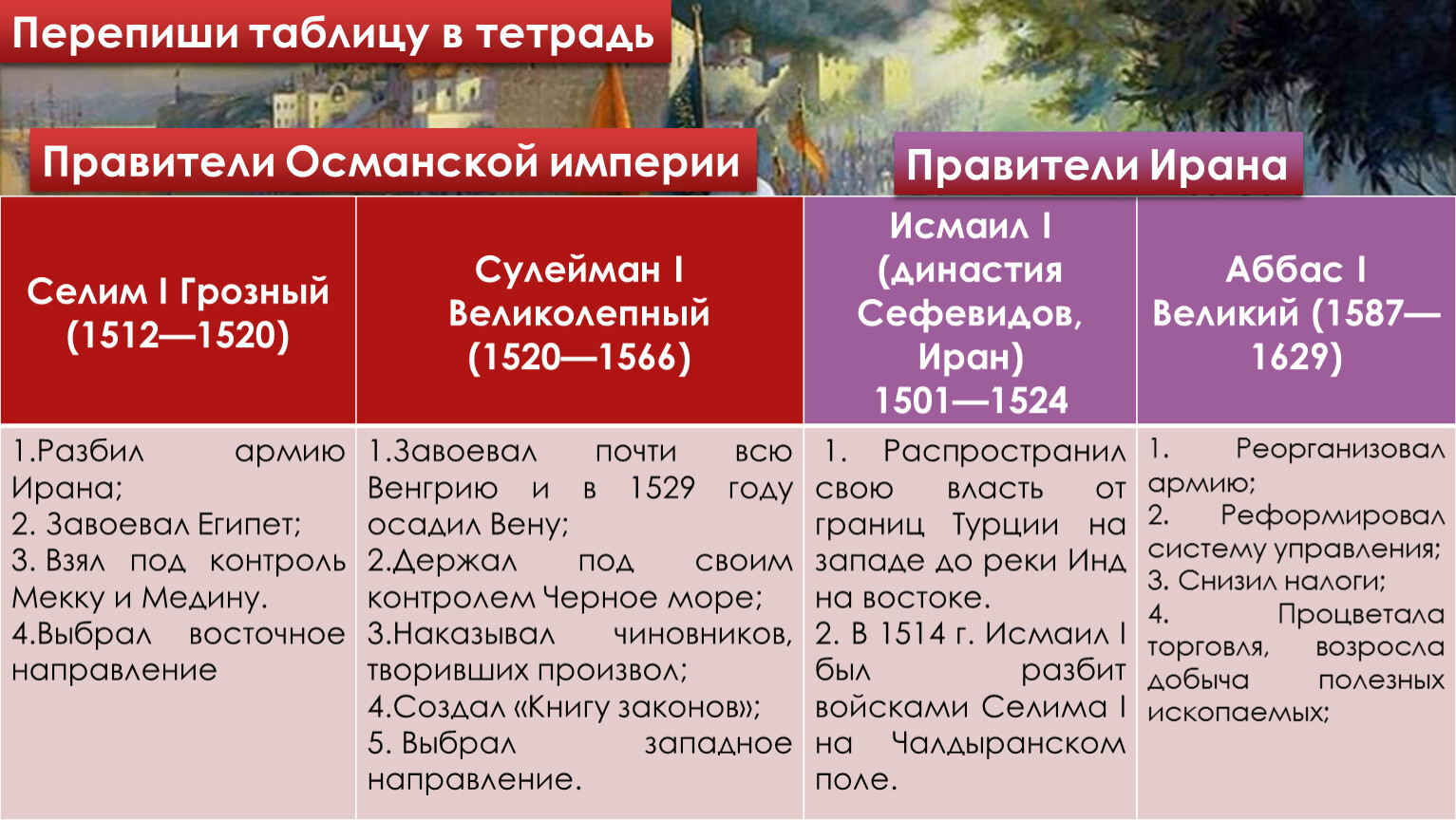 Селим I Грозный | Сулейман I Великолепный | Исмаил I (династия Сефевидов, Иран) | Аббас I Великий (1587—1629) |