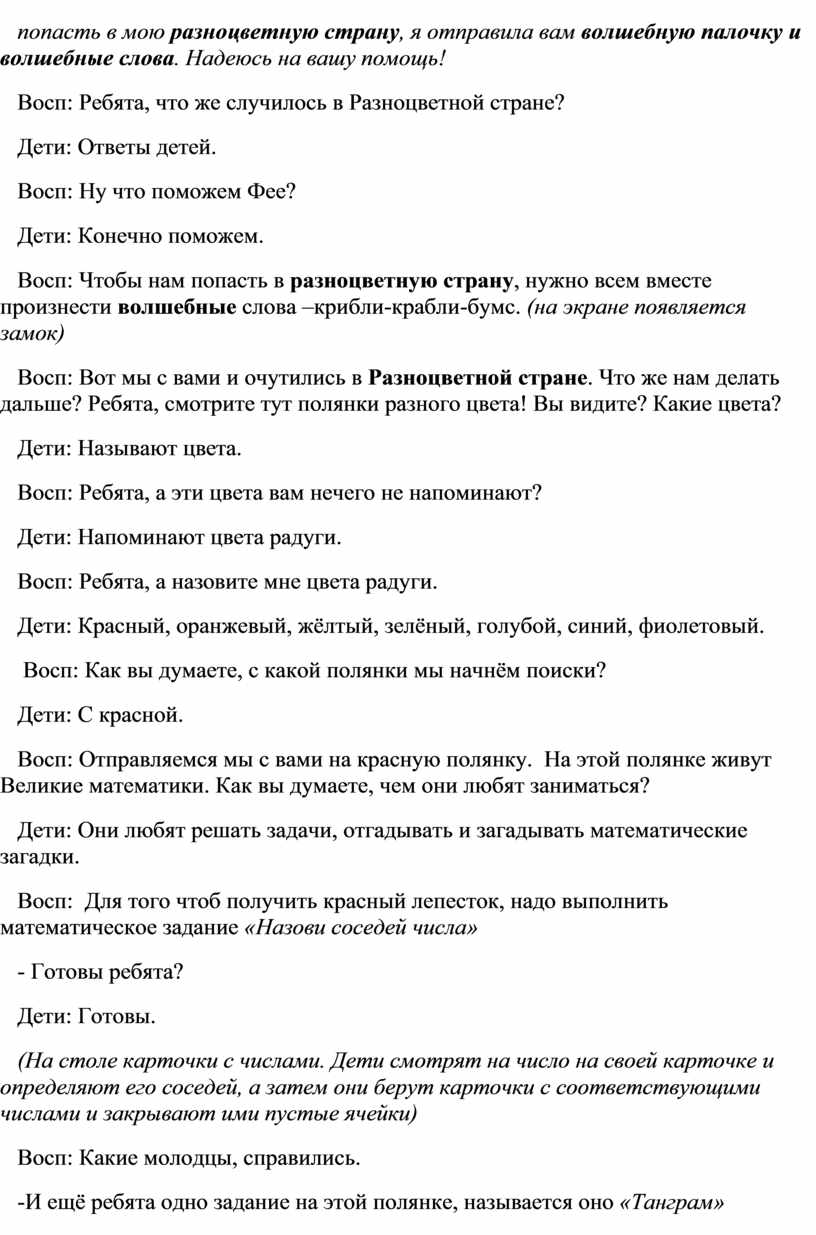 Письмо: Здравствуйте, ребята. Я Сказочная Фея Разноцветной Страны. В нашей стране есть волшебный цветок цветик - семицветик, за которым мы с моими помощниками бережно ухаживаем уже много лет. И он нам очень дорог. Но с ним произошла беда. Подул сильный, злой ветер - ветродуй и все лепесточки разлетелись. И чтобы их собрать, нужно выполнить задания. Ребята, хочу обратиться к вам за помощью, мне без вас не справиться. А чтобы вы смогли попасть в мою разноцветную страну, я отправила вам волшебную палочку и волшебные слова. Надеюсь на вашу помощь!
