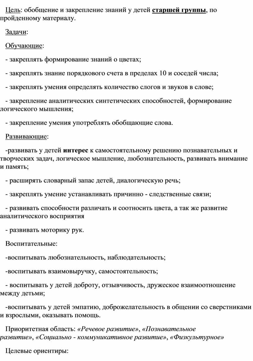 Приоритетная область: «Речевое развитие», «Познавательное развитие», «Социально - коммуникативное развитие», «Физкультурное»