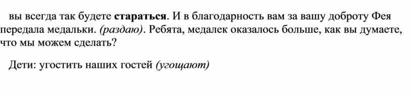 - Спасибо вам ребята, вы так много знаете, были внимательными, сообразительными, помогали друг другу, поэтому так хорошо справились со всеми заданиями, которые встречались нам во время путешествия. Я думаю, что вы всегда так будете стараться. И в благодарность вам за вашу доброту Фея передала медальки. (раздаю). Ребята, медалек оказалось больше, как вы думаете, что мы можем сделать?