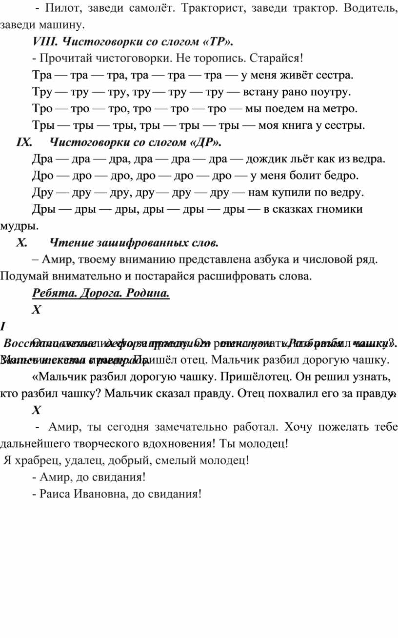 XI. Восстановление деформированного текстом «Разбитая чашка». Запись текста в тетрадь.
