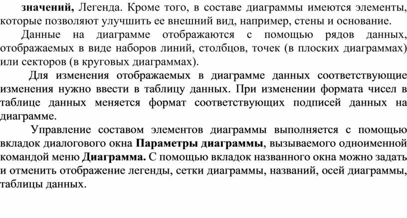 Окно с диаграммой позволяет оперативно оценивать тот вид, который диаграмма будет иметь после закрытия диалога. Вид диаграммы зависит от содержимого таблицы данных и выполненных настроек формата диаграммы. В составе диаграммы наиболее важными являются следующие элементы-Ось значений, Ось категорий, Ось ряда данных, Основные линии сетки оси значений, Легенда. Кроме того, в составе диаграммы имеются элементы, которые позволяют улучшить ее внешний вид, например, стены и основание.