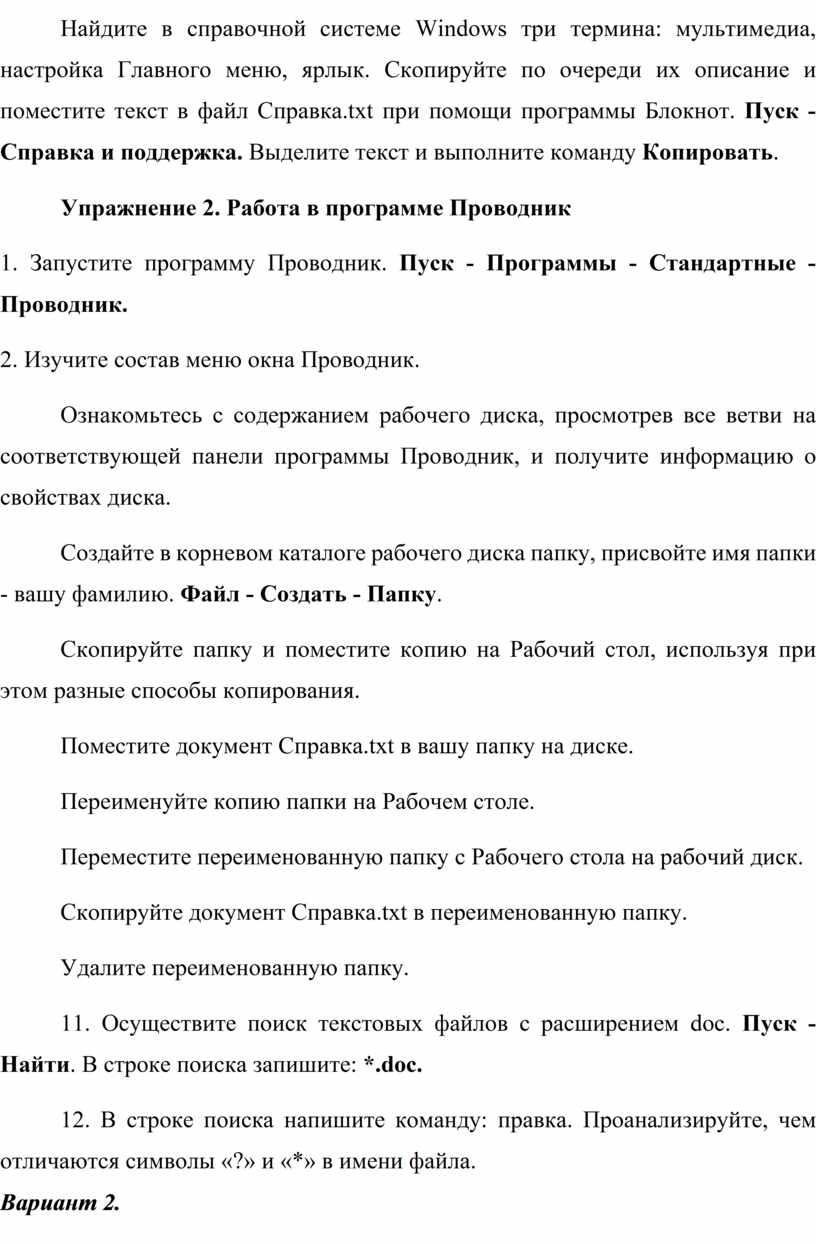 Найдите в справочной системе Windows три термина: мультимедиа, настройка Главного меню, ярлык. Скопируйте по очереди их описание и поместите текст в файл Справка.txt при помощи программы Блокнот. Пуск - Справка и поддержка. Выделите текст и выполните команду Копировать.