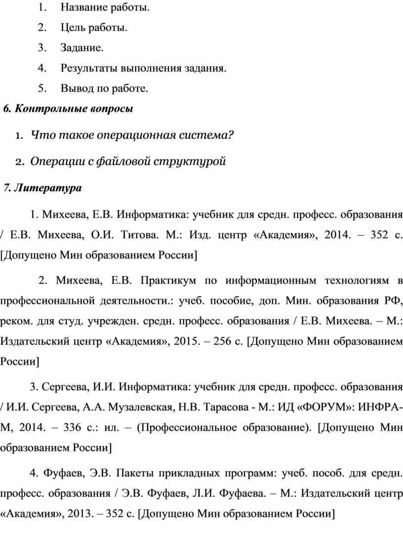 1. Михеева, Е.В. Информатика: учебник для средн. професс. образования / Е.В. Михеева, О.И. Титова. М.: Изд. центр «Академия», 2014. – 352 с. [Допущено Мин образованием России]