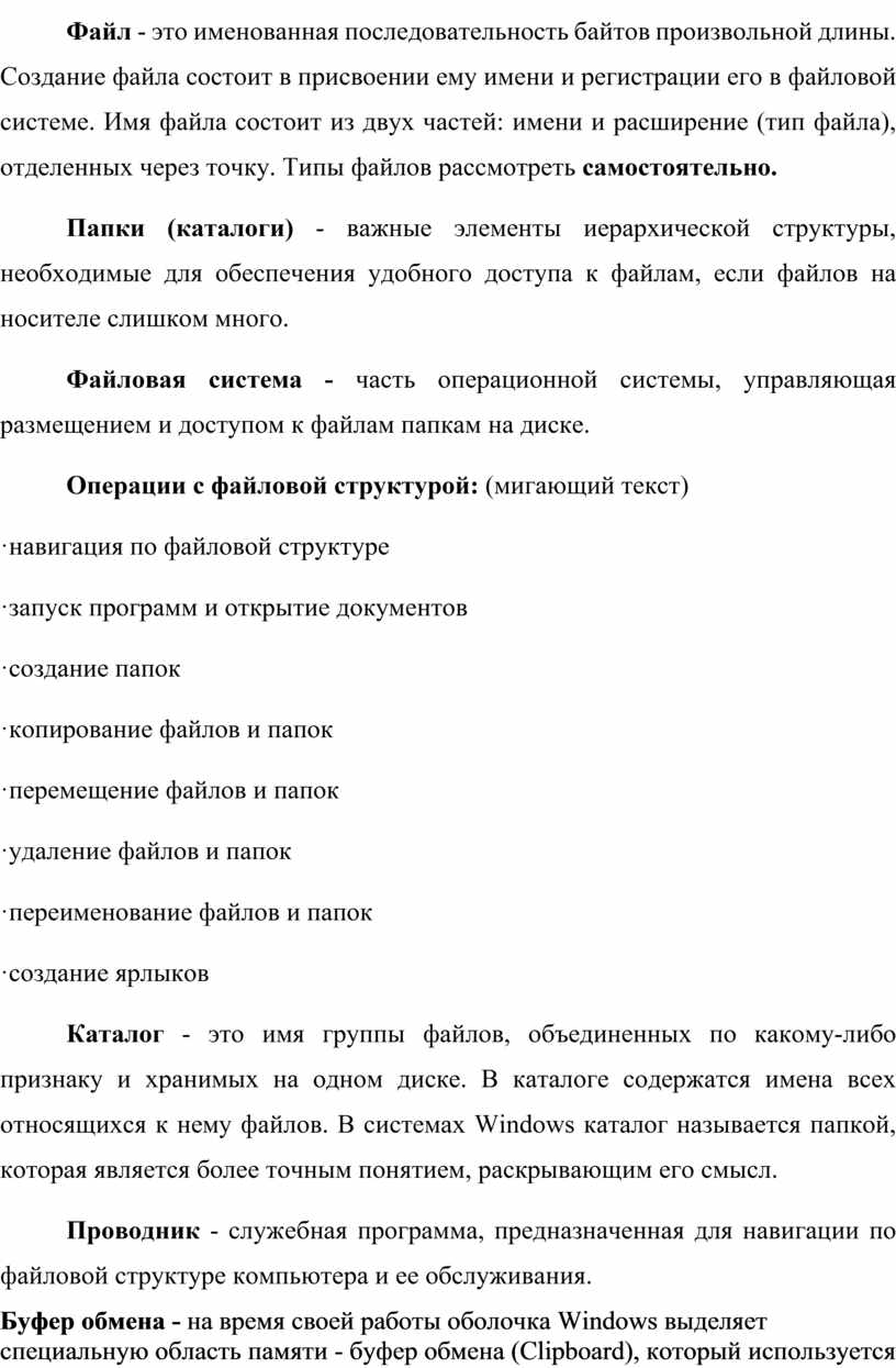 Файл - это именованная последовательность байтов произвольной длины. Создание файла состоит в присвоении ему имени и регистрации его в файловой системе. Имя файла состоит из двух частей: имени и расширение (тип файла), отделенных через точку. Типы файлов рассмотреть самостоятельно.