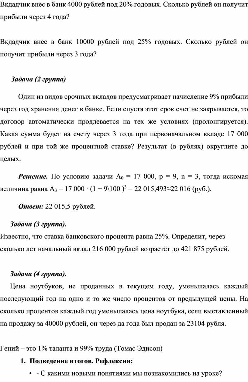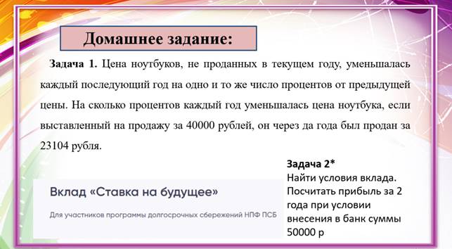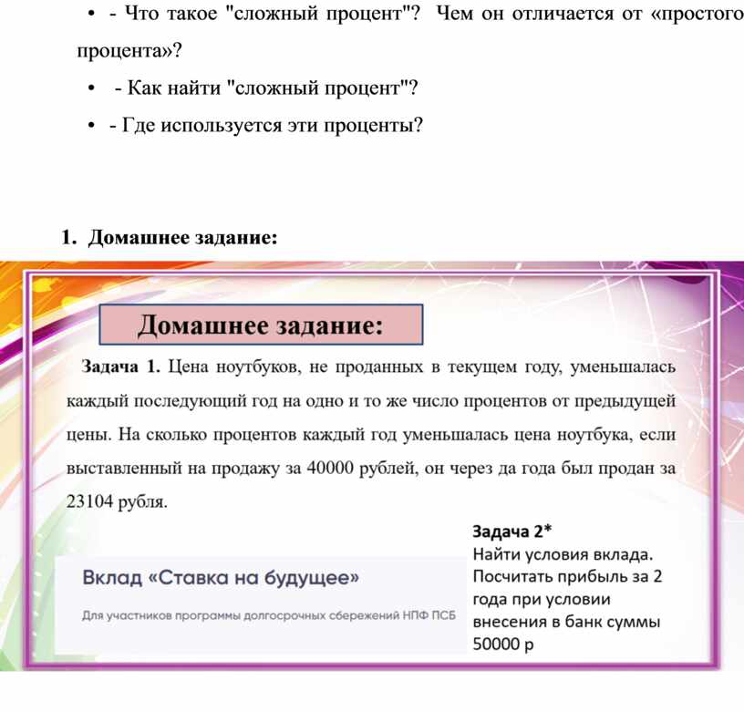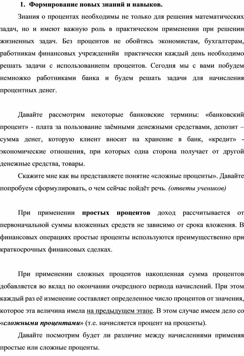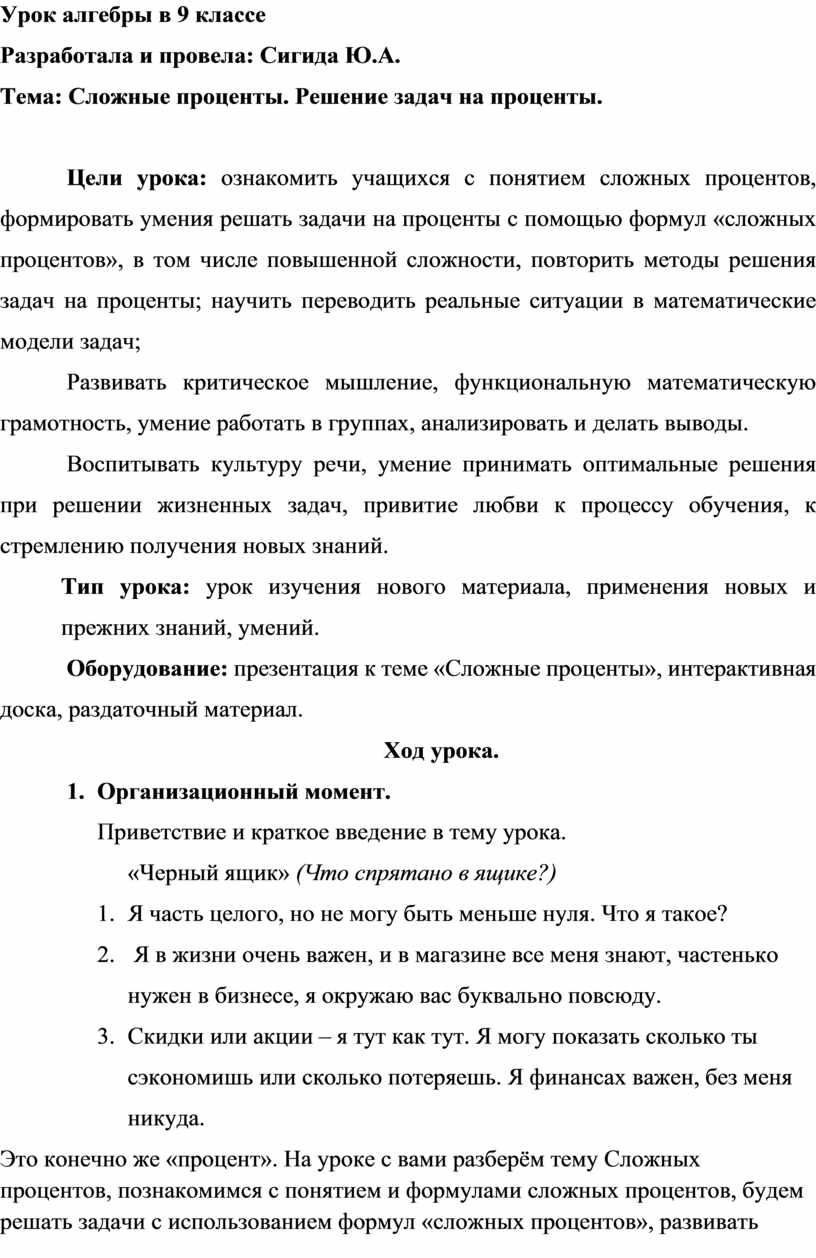 Оборудование: презентация к теме «Сложные проценты», интерактивная доска, раздаточный материал.