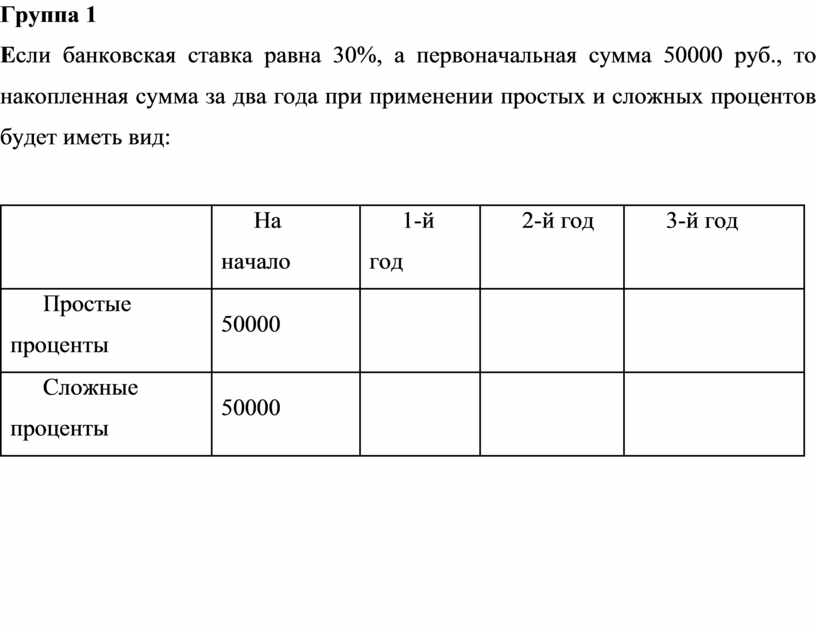 Если банковская ставка равна 30%, а первоначальная сумма 50000 руб., то накопленная сумма за первый год при применении простых и сложных процентов будет иметь вид: