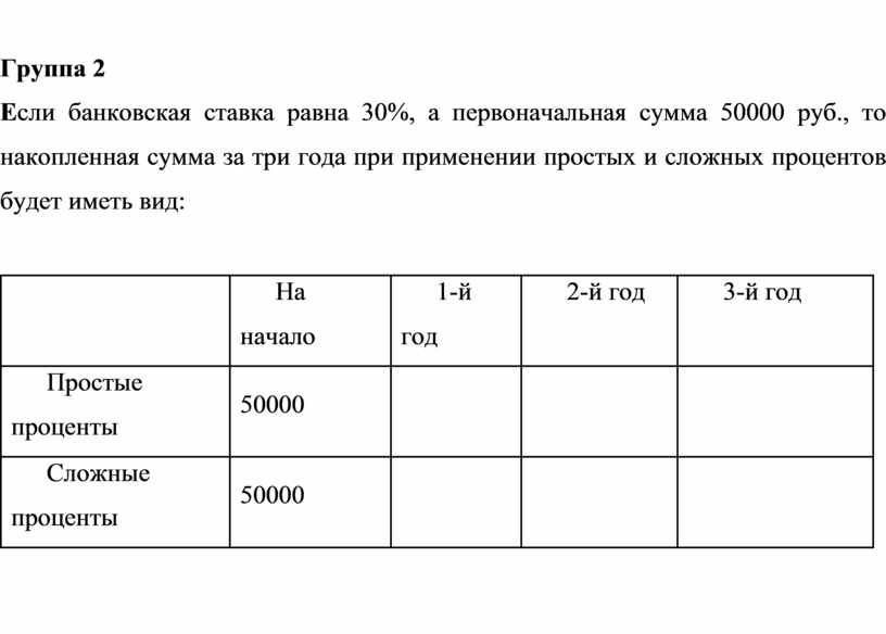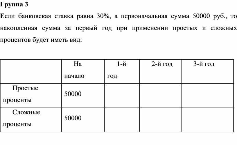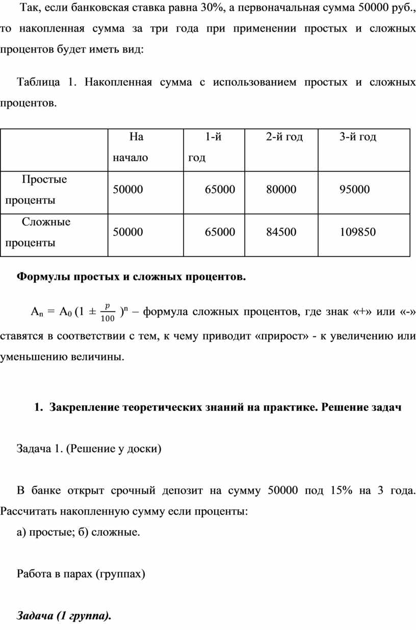 Так, если банковская ставка равна 30%, а первоначальная сумма 50000 руб., то накопленная сумма за три года при применении простых и сложных процентов будет иметь вид: