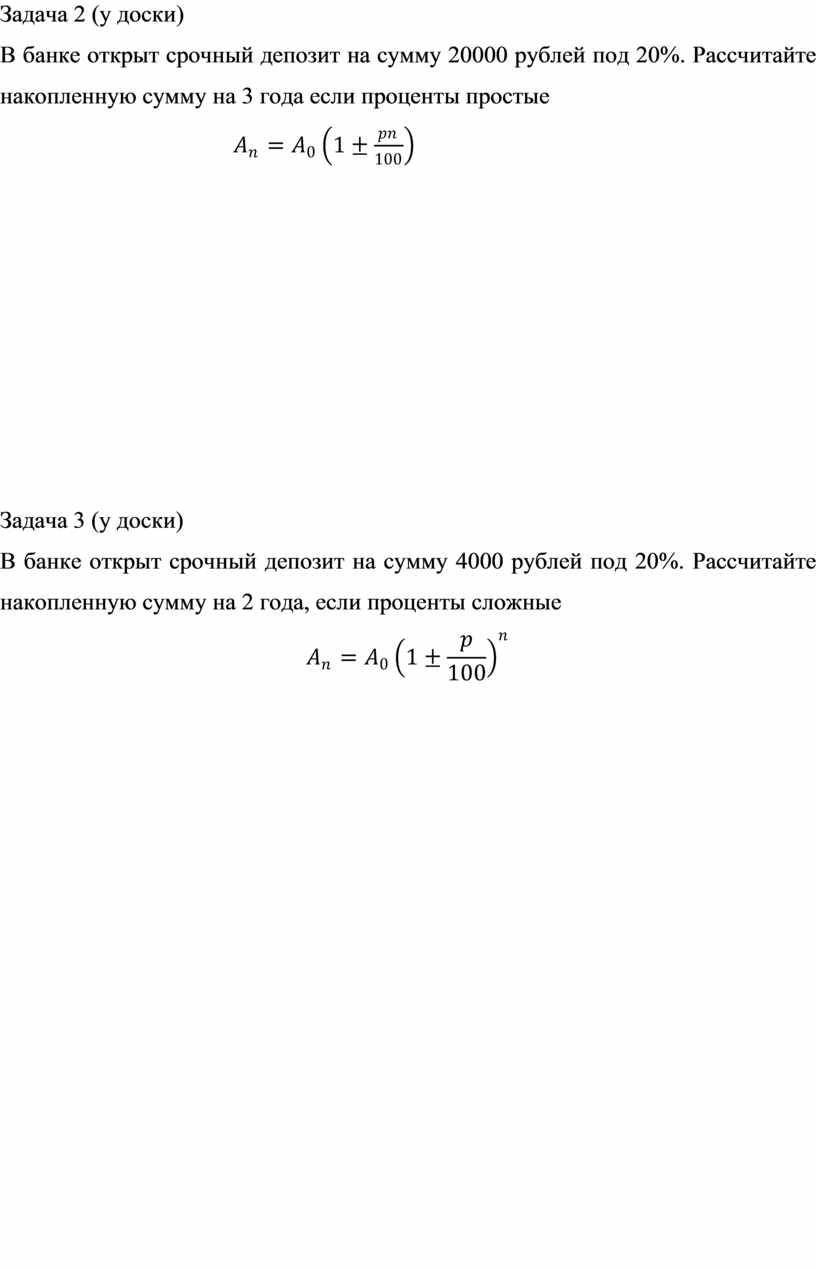 В банке открыт срочный депозит на сумму 20000 рублей под 20%. Рассчитайте накопленную сумму на 3 года если проценты простые