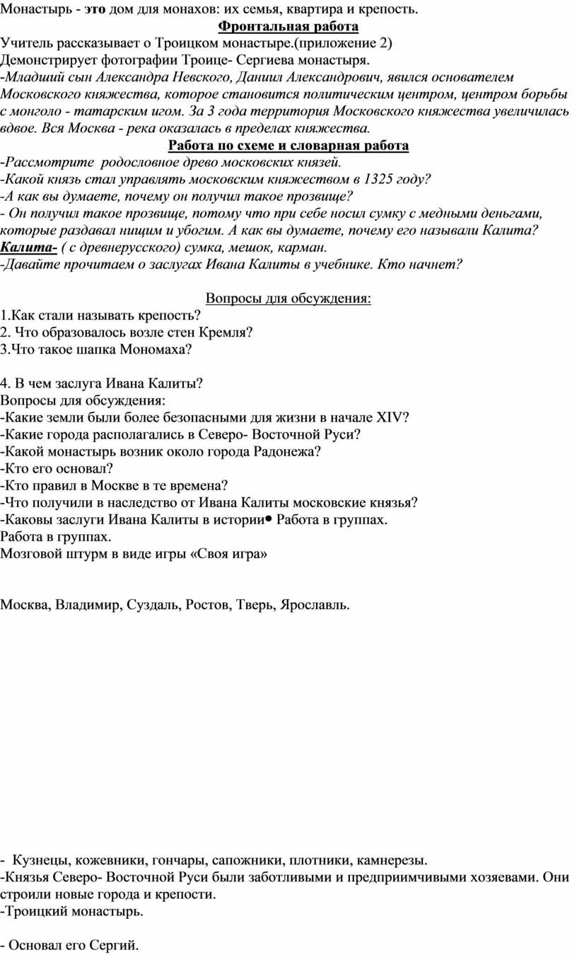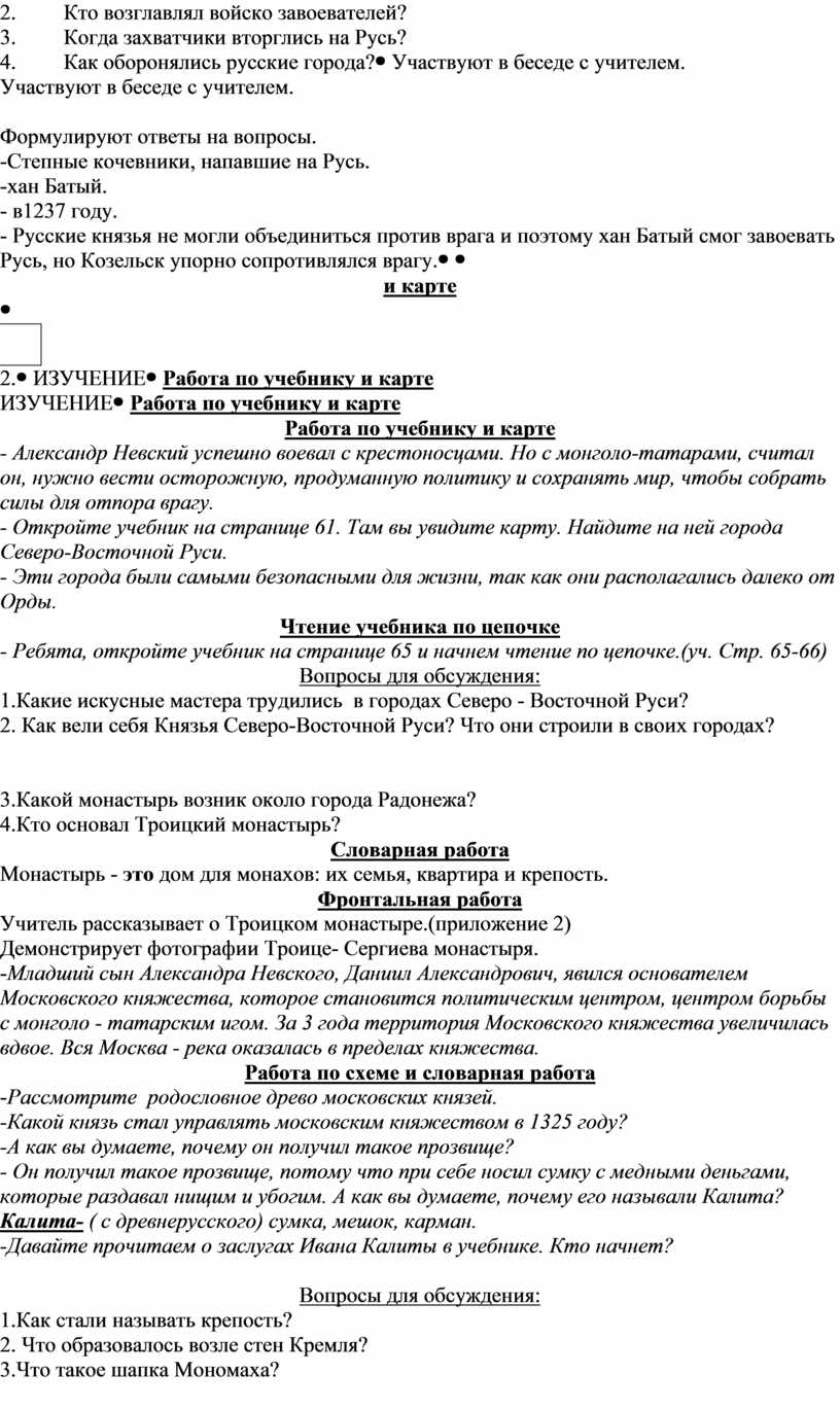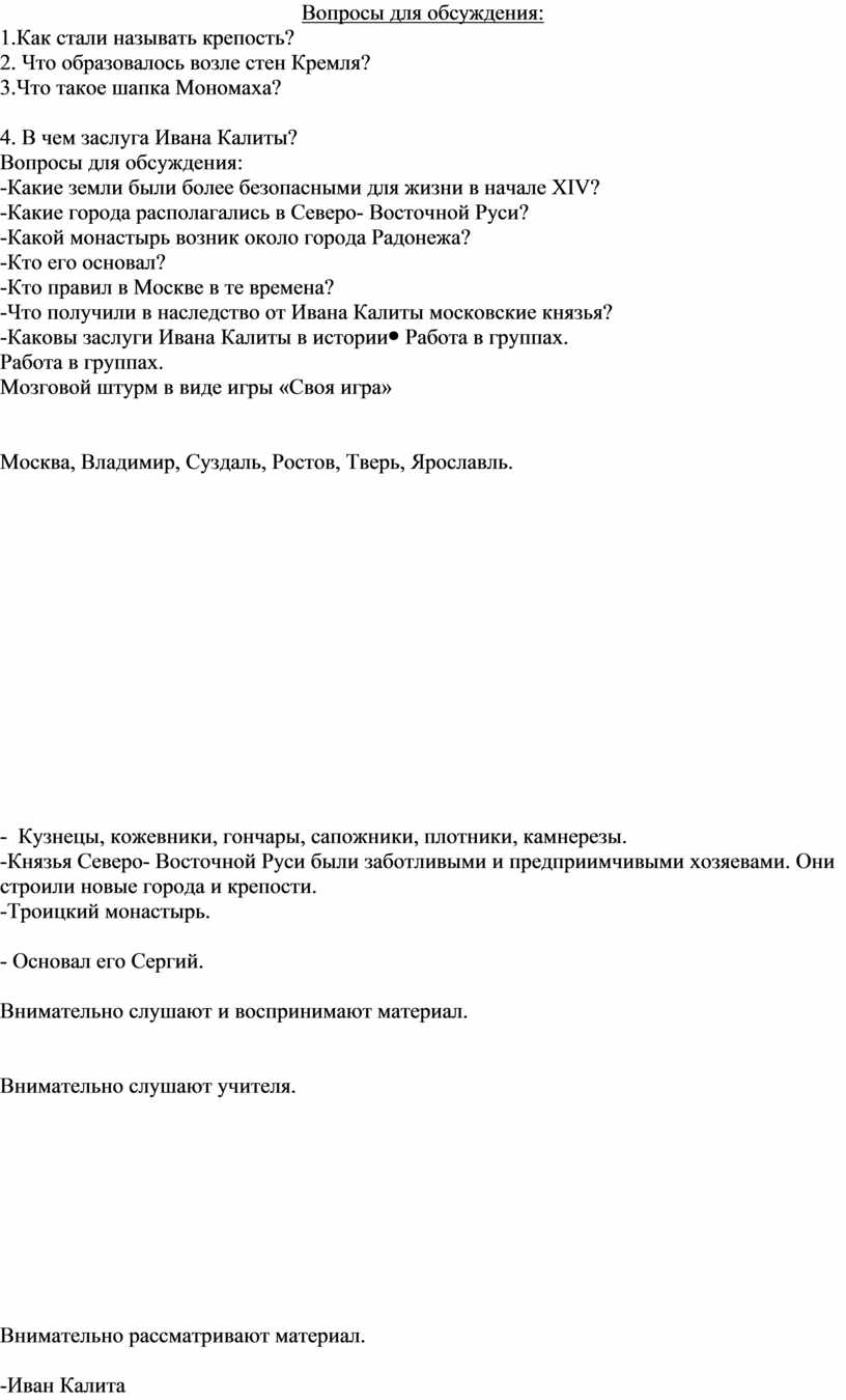 Обучающиеся читают по цепочке материал, предложенный в учебнике. (стр. 66-69) Отвечают на вопросы учителя. -Кремль -Торжище -Великокняжеский головной убор. -Иван Калита сумел войти в доверие к хану Золотой Орды, а также он стал собирать русские земли вокруг Москвы. |