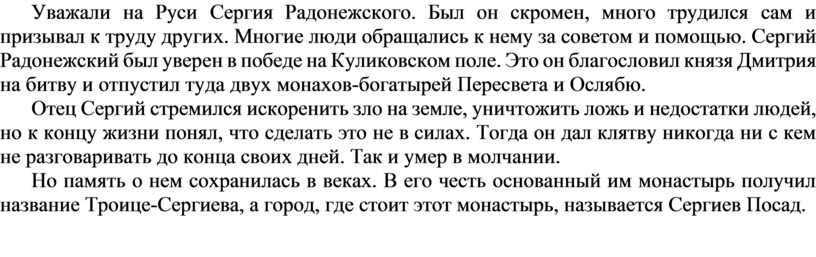 Уважали на Руси Сергия Радонежского. Был он скромен, много трудился сам и призывал к труду других. Многие люди обращались к нему за советом и помощью. Сергий Радонежский был уверен в победе на Куликовском поле. Это он благословил князя Дмитрия на битву и отпустил туда двух монахов-богатырей Пересвета и Ослябю.