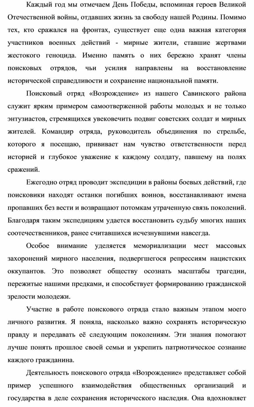 Каждый год мы отмечаем День Победы, вспоминая героев Великой Отечественной войны, отдавших жизнь за свободу нашей Родины. Помимо тех, кто сражался на фронтах, существует еще одна важная категория участников военных действий - мирные жители, ставшие жертвами жестокого геноцида. Именно память о них бережно хранят члены поисковых отрядов, чьи усилия направлены на восстановление исторической справедливости и сохранение национальной памяти. Поисковый отряд «Возрождение» из нашего Савинского района служит ярким примером самоотверженной работы молодых и не только энтузиастов, стремящихся увековечить подвиг советских солдат и мирных жителей. Командир отряда, руководитель объединения по стрельбе, которого я посещаю, прививает нам чувство ответственности перед историей и глубокое уважение к каждому солдату, павшему на полях сражений. Ежегодно отряд проводит экспедиции в районы боевых действий, где поисковики находят останки погибших воинов, восстанавливают имена пропавших без вести и возвращают потомкам утраченную связь поколений. Благодаря таким экспедициям удается восстановить судьбу многих наших соотечественников, ранее считавшихся исчезнувшими навсегда. Особое внимание уделяется мемориализации мест массовых захоронений мирного населения, подвергшегося репрессиям нацистских оккупантов. Это позволяет обществу осознать масштабы трагедии, пережитые нашими предками, и способствует формированию гражданской зрелости молодежи. Участие в работе поискового отряда стало важным этапом моего личного развития. Я поняла, насколько важно сохранять историческую правду и передавать её следующим поколениям. Эти знания помогают лучше понять прошлое своей семьи и укрепить патриотическое сознание каждого гражданина. Деятельность поискового отряда «Возрождение» представляет собой пример успешного взаимодействия общественных организаций и государства в деле сохранения исторического наследия. Она вдохновляет молодежь активно участвовать в мероприятиях, направленных на укрепление единства нации и развитие чувства гордости за свою страну. Таким образом, работа поисковых отрядов играет ключевую роль в сохранении памяти о жертвах геноцида советского народа. Память о геноциде учит нас ценить мир, уважать человеческую жизнь, быть внимательными к проявлениям ненависти. Пока такие отряды, как «Возрождение», продолжают свою деятельность, эта память остается живой, а история - подлинной. Мы обязаны помнить о каждом герое, защитнике и жертве той страшной войны, чтобы будущие поколения могли жить свободно и достойно.