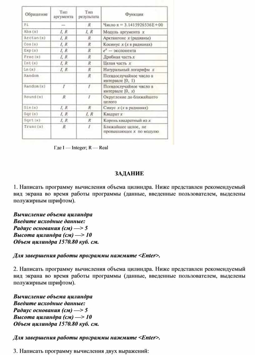 1. Написать программу вычисления объема цилиндра. Ниже представлен рекомендуемый вид экрана во время работы программы (данные, введенные пользователем, выделены полужирным шрифтом).