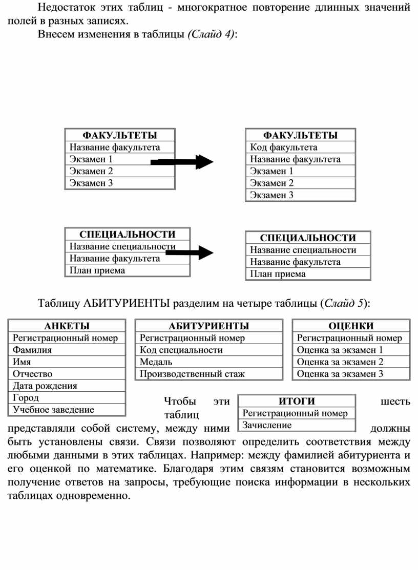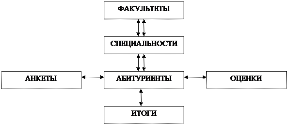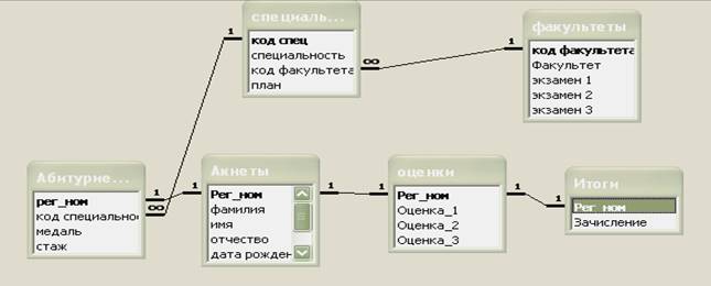 Чтобы эти шесть таблиц представляли собой систему, между ними должны быть установлены связи. Связи позволяют определить соответствия между любыми данными в этих таблицах. Например: между фамилией абитуриента и его оценкой по математике. Благодаря этим связям становится возможным получение ответов на запросы, требующие поиска информации в нескольких таблицах одновременно.