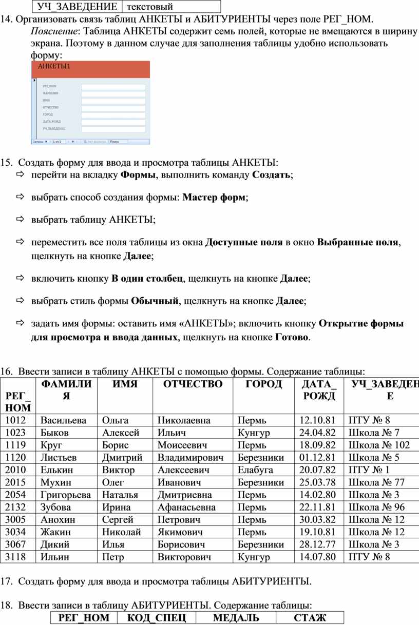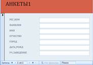16. Ввести записи в таблицу АНКЕТЫ с помощью формы. Содержание таблицы: