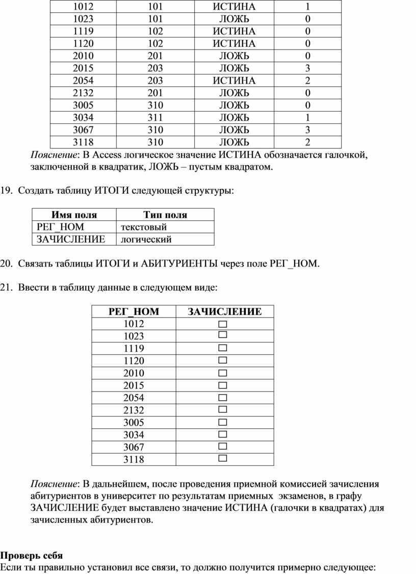 Пояснение: В Access логическое значение ИСТИНА обозначается галочкой, заключенной в квадратик, ЛОЖЬ – пустым квадратом.