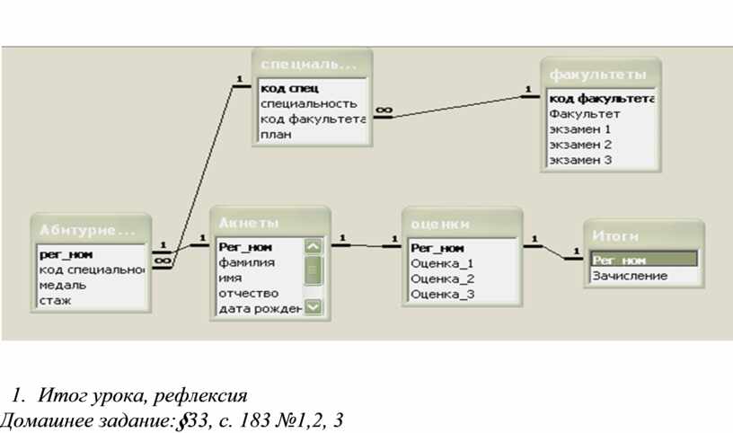 20. Связать таблицы ИТОГИ и АБИТУРИЕНТЫ через поле РЕГ_НОМ.