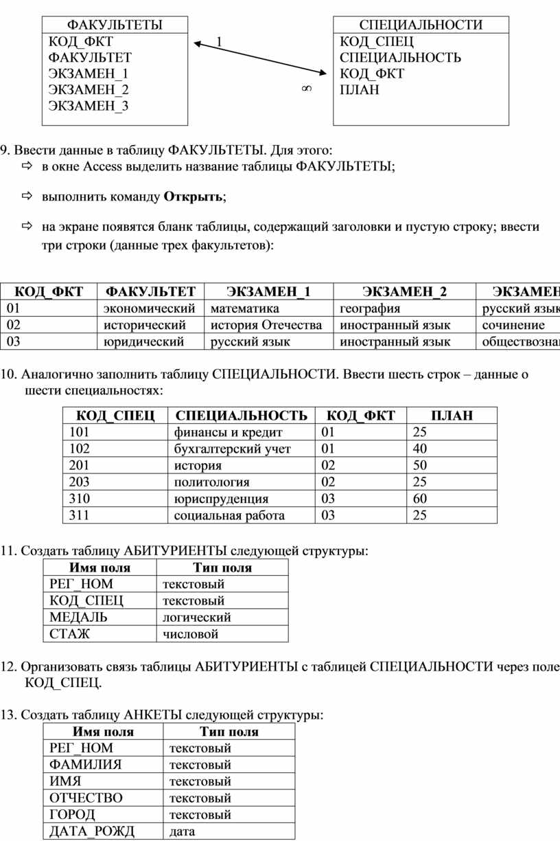 ð в таблице конструктора для всех полей таблицы ФАКУЛЬТЕТЫ указать имена, типы и свойства (размер, формат):
