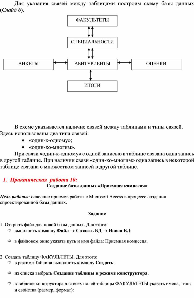 Для указания связей между таблицами построим схему базы данных (Слайд 6).