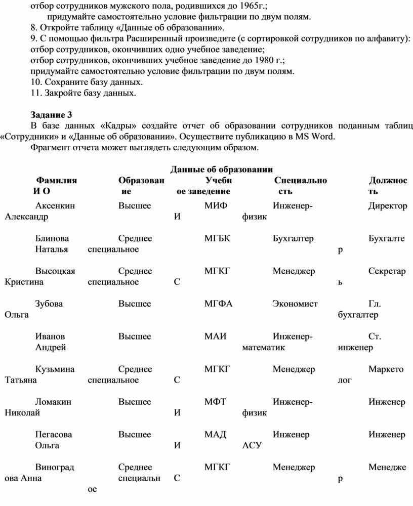 В базе данных «Кадры» создайте отчет об образовании сотрудников поданным таблиц «Сотрудники» и «Данные об образовании». Осуществите публикацию в MS Word.