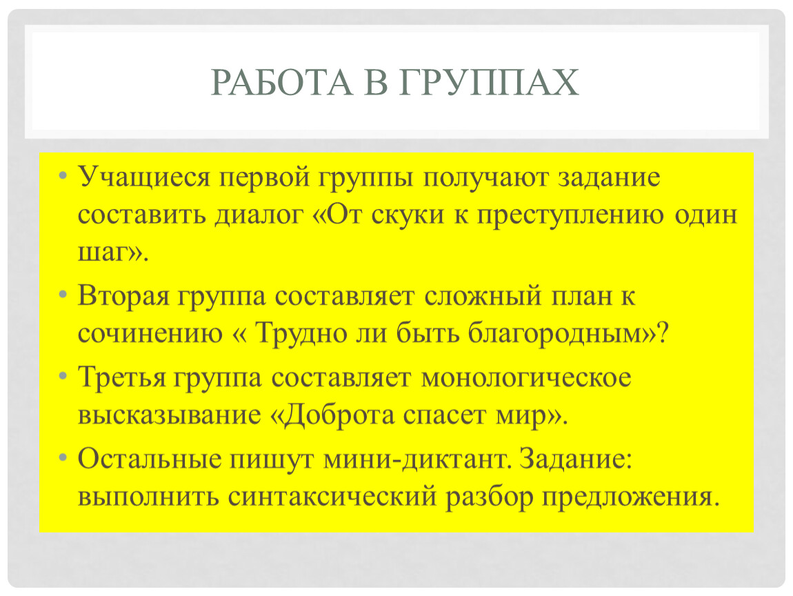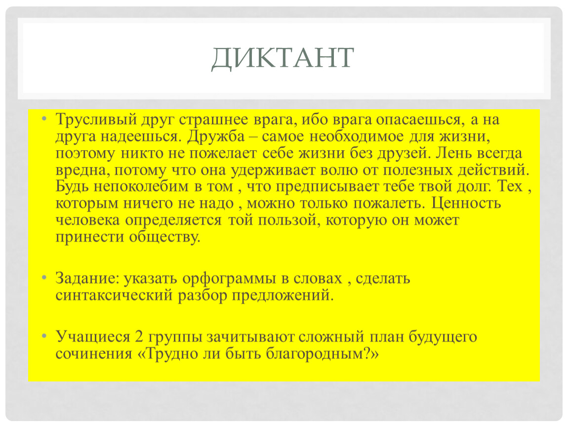 Учащиеся 2 группы зачитывают сложный план будущего сочинения «Трудно ли быть благородным?»