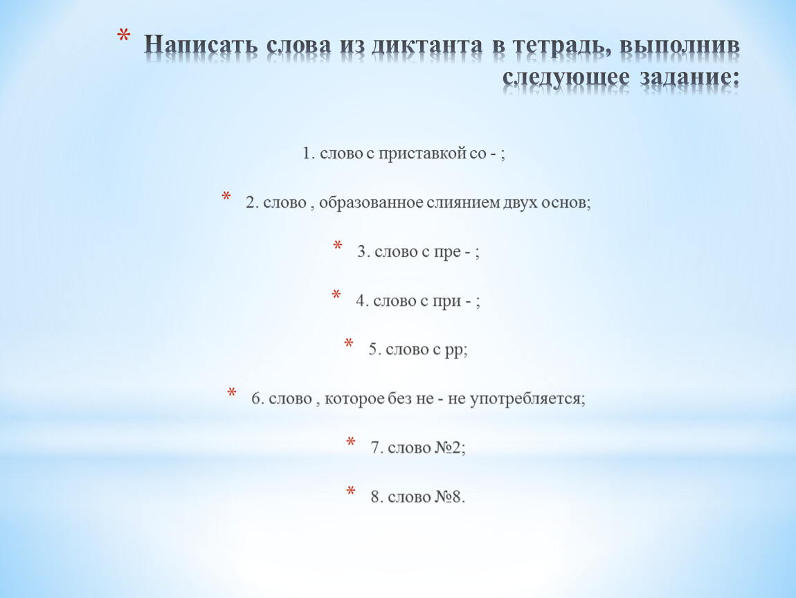 Написать слова из диктанта в тетрадь, выполнив следующее задание: