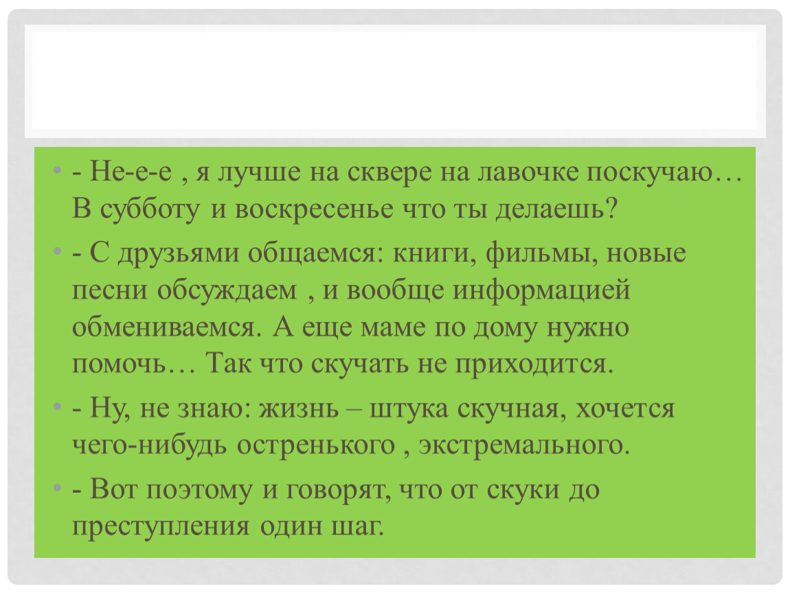 Учащиеся первой группы получают задание составить диалог «От скуки к преступлению один шаг».