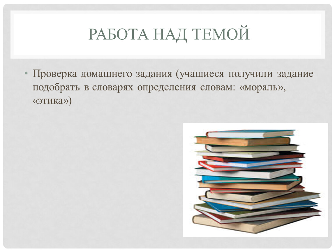 Проверка домашнего задания (учащиеся получили задание подобрать в словарях определения словам: «мораль», «этика»)