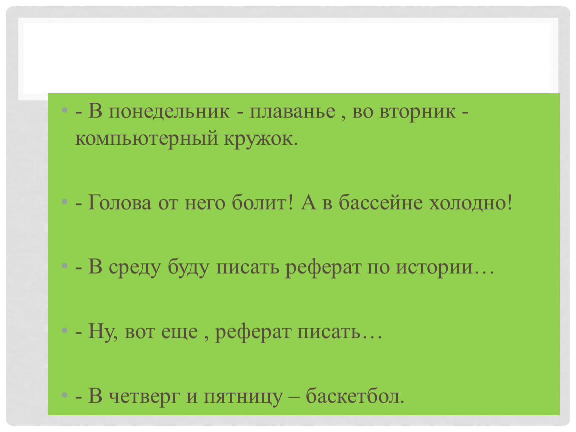 - В понедельник - плаванье , во вторник - компьютерный кружок.