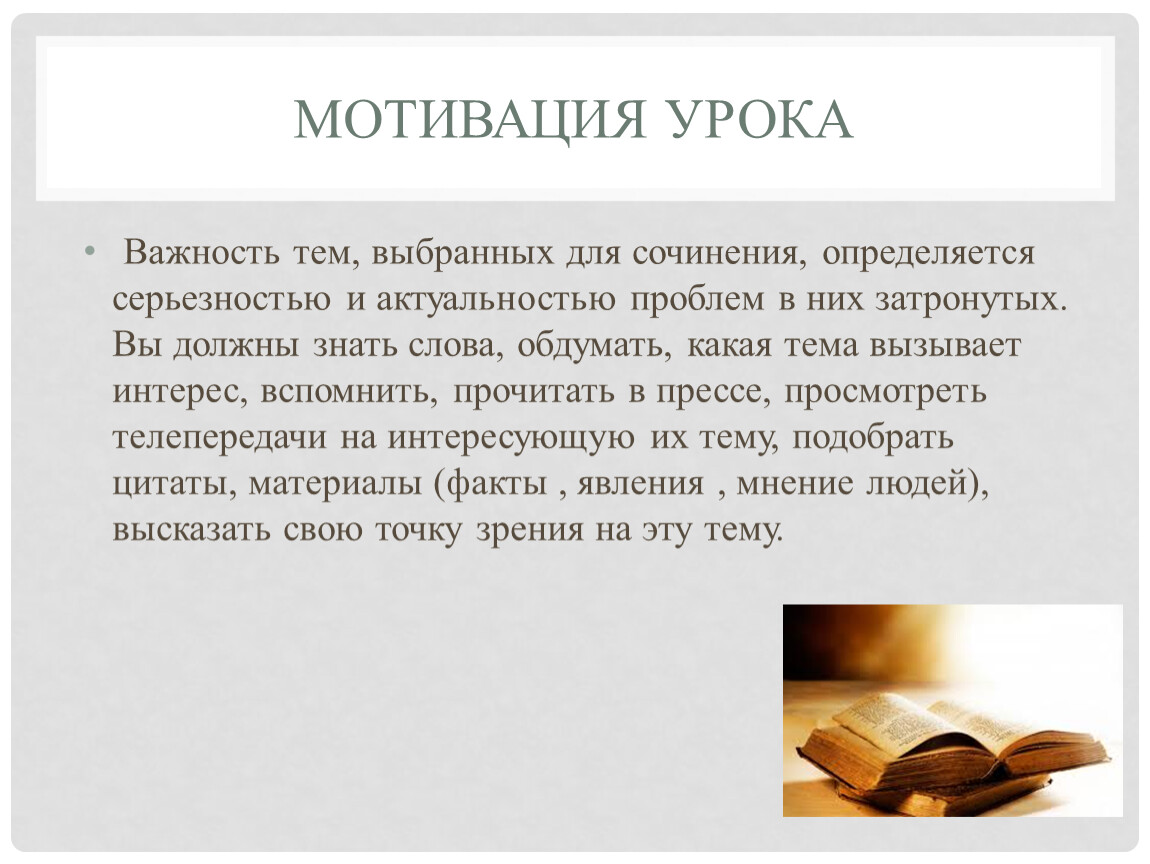 Важность тем, выбранных для сочинения, определяется серьезностью и актуальностью проблем в них затронутых. Вы должны знать слова, обдумать, какая тема вызывает интерес, вспомнить, прочитать в прессе, просмотреть телепередачи на интересующую их тему, подобрать цитаты, материалы (факты , явления , мнение людей), высказать свою точку зрения на эту тему.