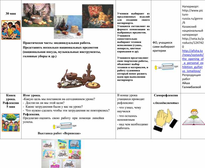 Натюрморт: http://www.picture-russia.ru/genre/6 Казахский национальный натюрморт http://veta.kz/products/1247420 http://afisha.kz/news/vystavki/the_opening_of_a_personal_exhibition_gulfairus_ismailova/ Репродукция работ Айша Галимбаевой |