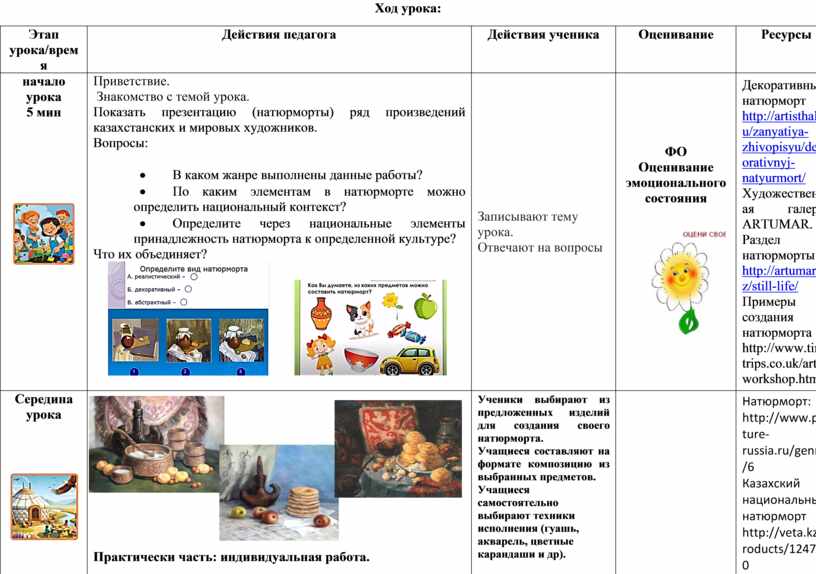 Приветствие. Знакомство с темой урока. Показать презентацию (натюрморты) ряд произведений казахстанских и мировых художников. Вопросы: