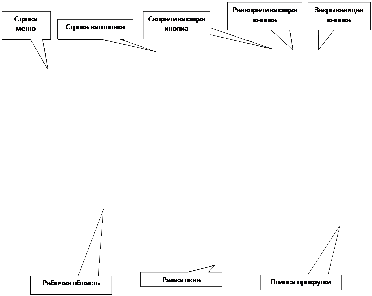 v элементы окна (строка заголовка, сворачивающая, разворачивающая и закрывающие кнопки, строка меню, рабочая область, полосы прокрутки, рамки окна).