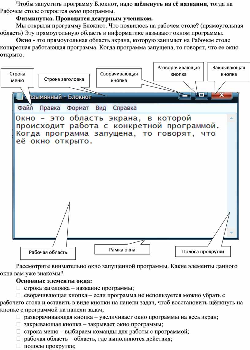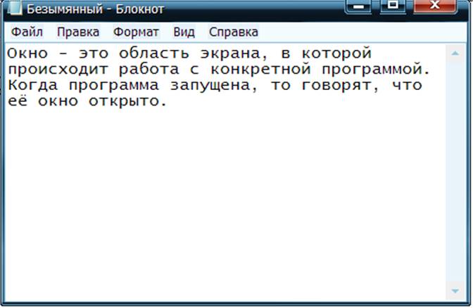 Мы открыли программу Блокнот. Что появилось на рабочем столе? (прямоугольная область) Эту прямоугольную область в информатике называют окном программы.