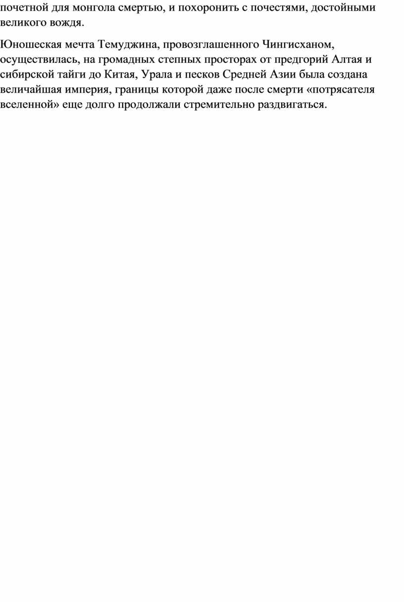 Юношеская мечта Темуджина, провозглашенного Чингисханом, осуществилась, на громадных степных просторах от предгорий Алтая и сибирской тайги до Китая, Урала и песков Средней Азии была создана величайшая империя, границы которой даже после смерти «потрясателя вселенной» еще долго продолжали стремительно раздвигаться.