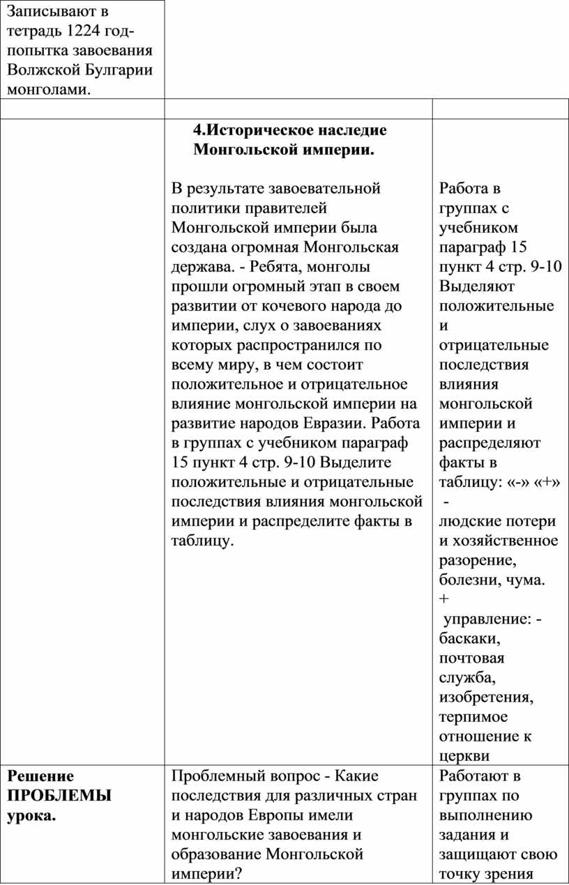 Воспитательная задача: высказывать свое мнение о положительном и отрицательном влиянии монгольской империи на развитие народов Евразии.