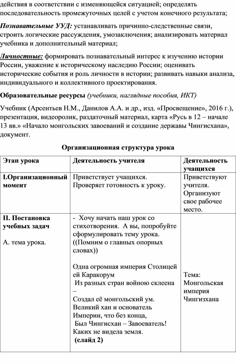 Учебник (Арсентьев Н.М., Данилов А.А. и др., изд. «Просвещение», 2016 г.), презентация, видеоролик, раздаточный материал, карта «Русь в 12 – начале 13 вв.» «Начало монгольских завоеваний и создание державы Чингисхана», документ.