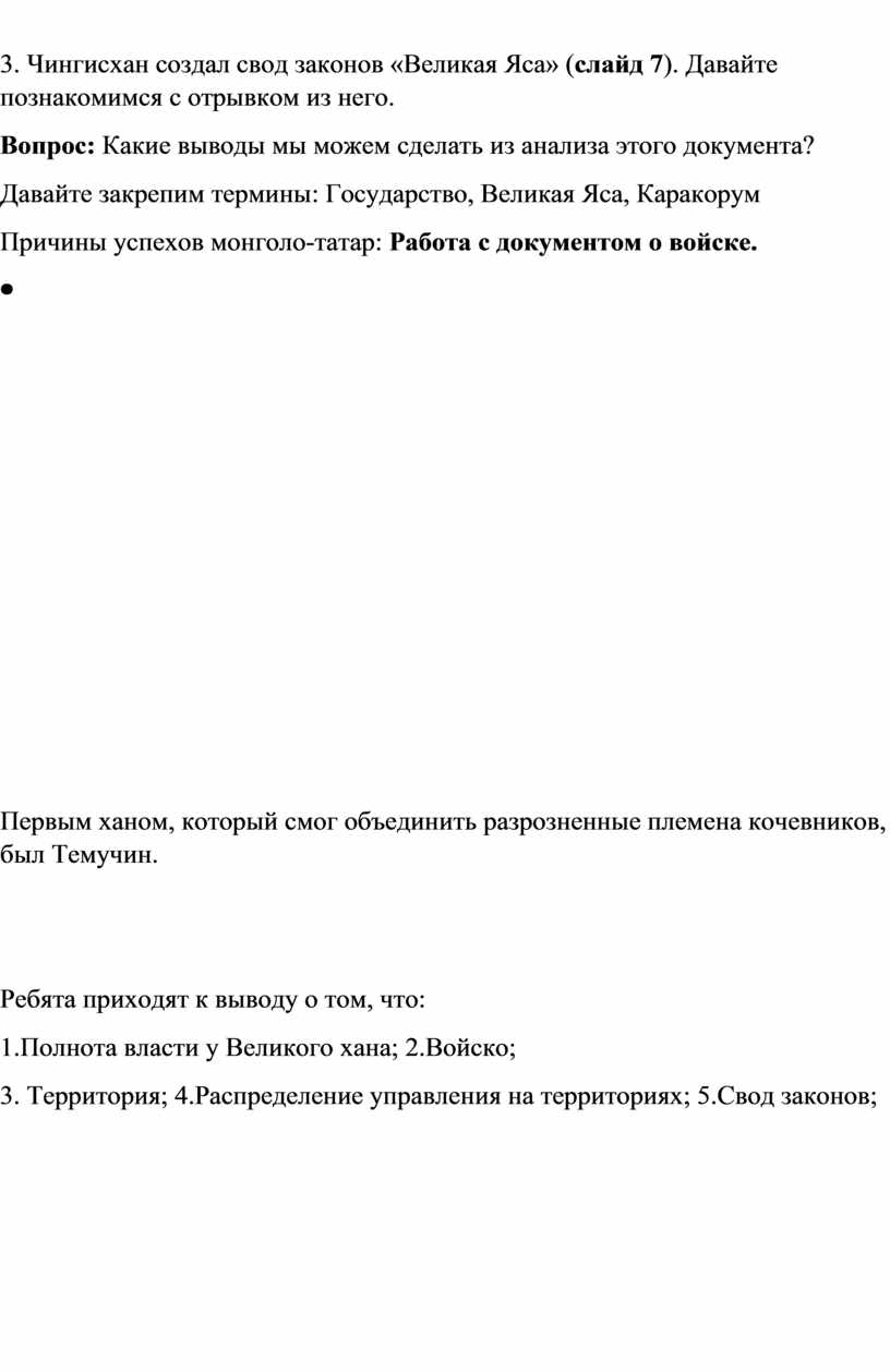 3. Чингисхан создал свод законов «Великая Яса» (слайд 7). Давайте познакомимся с отрывком из него. Вопрос: Какие выводы мы можем сделать из анализа этого документа? Давайте закрепим термины: Государство, Великая Яса, Каракорум Причины успехов монголо-татар: Работа с документом о войске.